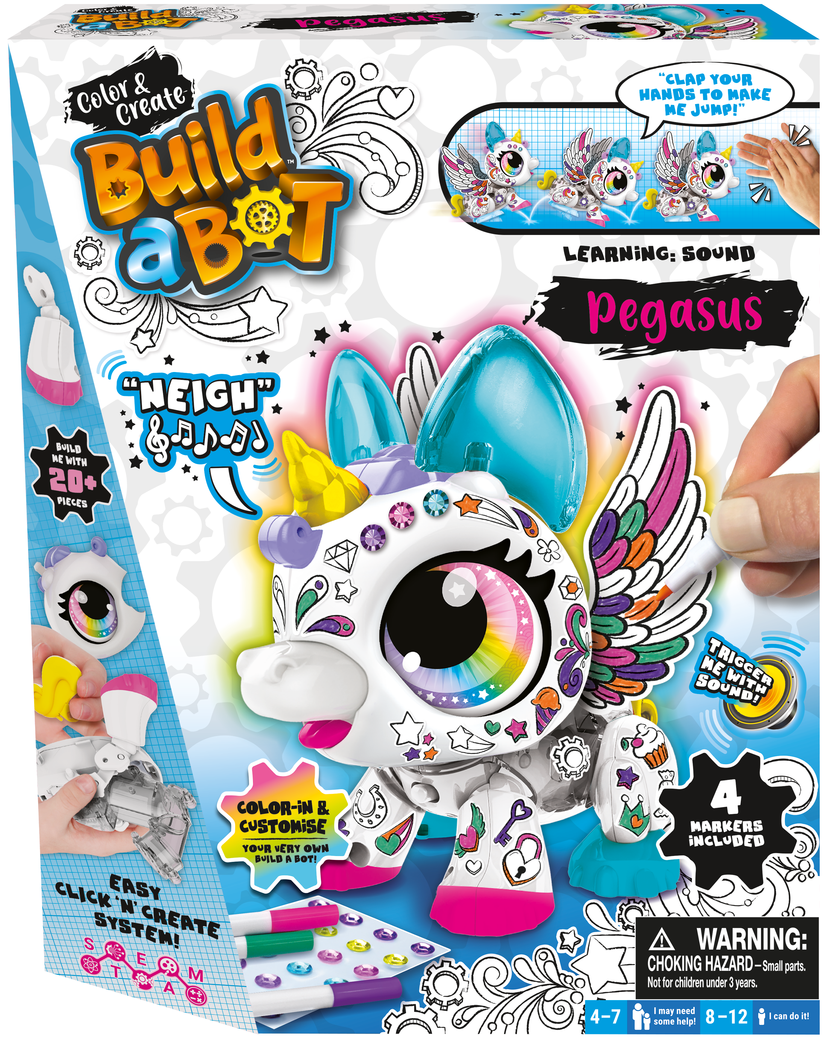 Build your very own working robotic pet! Using easy Click ‘n’ Create assembly steps, there’s no glue, so you can take your finished toy apart and start over again. Parts are clearly numbered, so just follow the step-by-step Learning Guide. A see-through shell means you can see inside: all the moving parts, levers and gears you put together bring your bot to life! Flick the tail up to make it hop up to 10 times. A hidden microphone responds to sound – clap your hands to make your Pegasus jump, and listen as it neighs happily! The kit includes over 20 pieces along with sparkling gems and stickers you can color with the 4 markers provided. When you’re done customizing your pet, name it by filling out your very own Build Certificate. Also available as a Corgi Pup. Brings S.T.E.A.M. learning to life (Science, Technology, Engineering, Art & Math). Recommended for ages 4-7 with help, 8-12 for independent play. Requires 2 AA batteries (not included).
