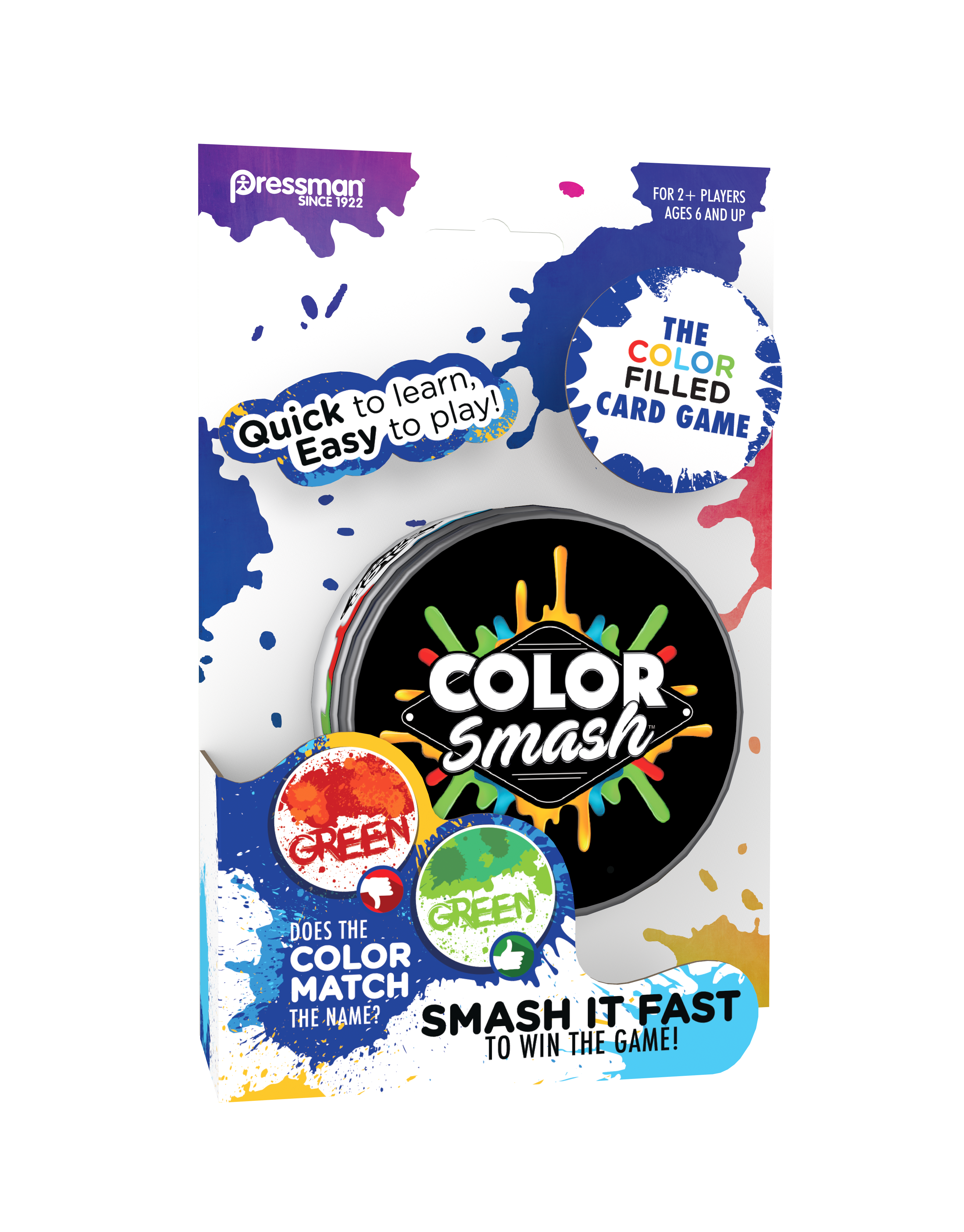You’ve got to be smart and fast to win at Color Smash! The eye sees one thing while your brain perceives the other. Take turns laying your cards down on the table – remember to pay attention, or they may get stolen! Smash the splat with the same color and name to win the deck! Unique, colorful storage “paint can” holds cards for future play. For 2 or more players, ages 6 and up.