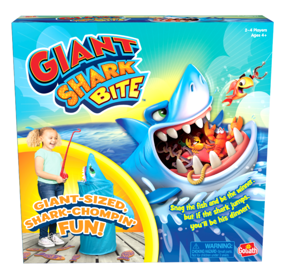 Grab your fishing pole and get ready for BIG fun in this super-sized reimagination of the original Shark Bite! What’s the biggest fish you can catch? Is it a 1 or a 2? Maybe a 3 for the catch of the day! But watch out – the bigger the number, the bigger the risk that you might be this shark’s next meal! Be careful because this GIANT shark can jump nearly THREE feet into the air! Will you be a first-class fisherman, or will you fall hook, line, and sinker into this shark’s BIG mouth? Some assembly required. Includes 1 Giant Shark, 1 Plastic Shark Base (2 Pieces), 1 Fishing Pole, 1 Splash Cover, 1 Orange Plastic Fish, 20 Foam Fish, and Complete Instructions – no batteries required for kid-powered fun! Recommended for 2-4 players, ages 4 and up.